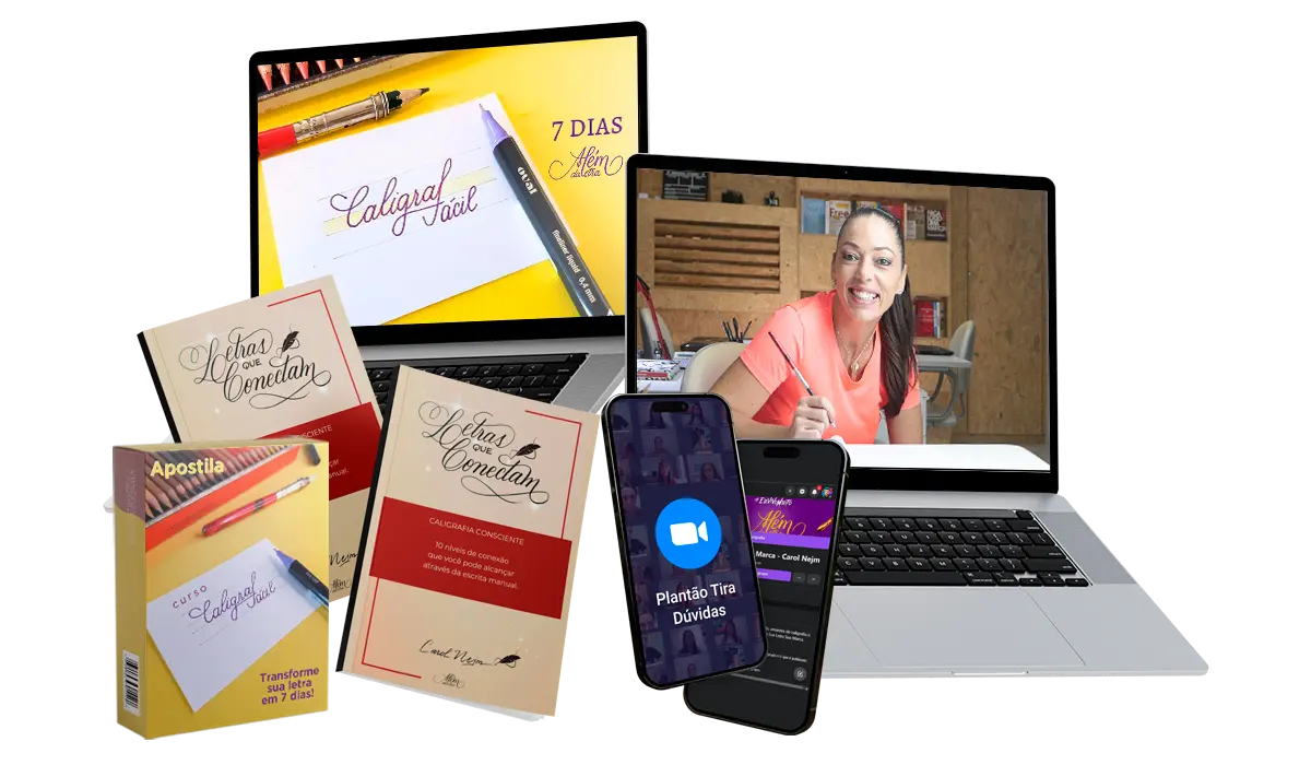 E vai também descobrir a diferença entre os métodos comuns de adestramento e a Caligrafia Consciente, recebendo a Educação Caligráfica que vai te levar a entender o processo de escrita e os 7 aspectos fundamentais para ter sua melhor letra e transformar sua caligrafia de uma vez por todas!